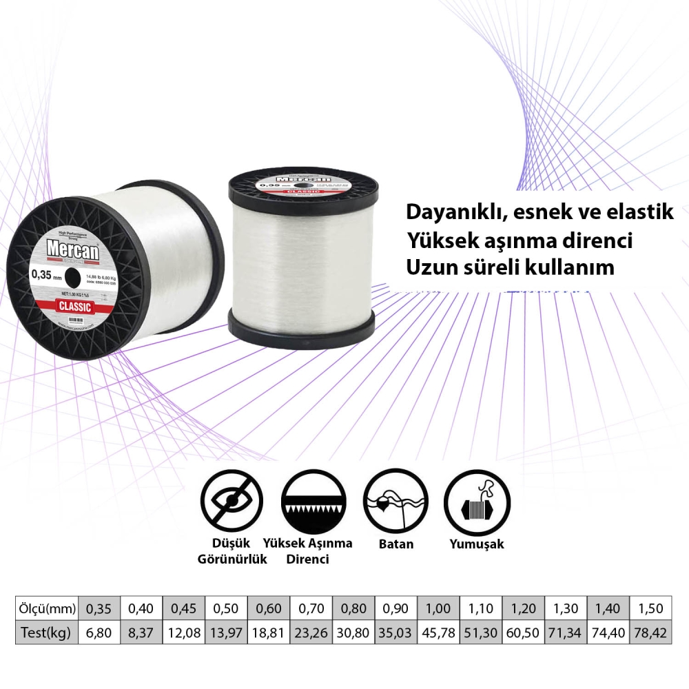 - Mercan Classic misina iyi çekiş gücü, düğüm mukavemeti ve ekonomik fiyat özelliği ile öne çıkmaktadır.