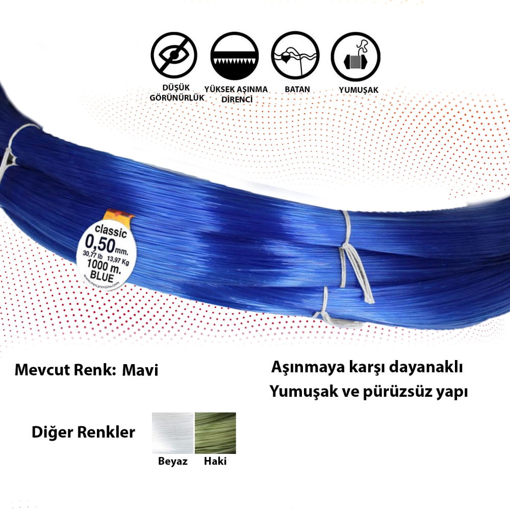 Dalga aşındırmasına karşı da iyi direnç gösterir. Uzun süreli kullanıma elverişlidir. Mercan Classıc misina amatör olta balıkçılar için ideal seçimdir.