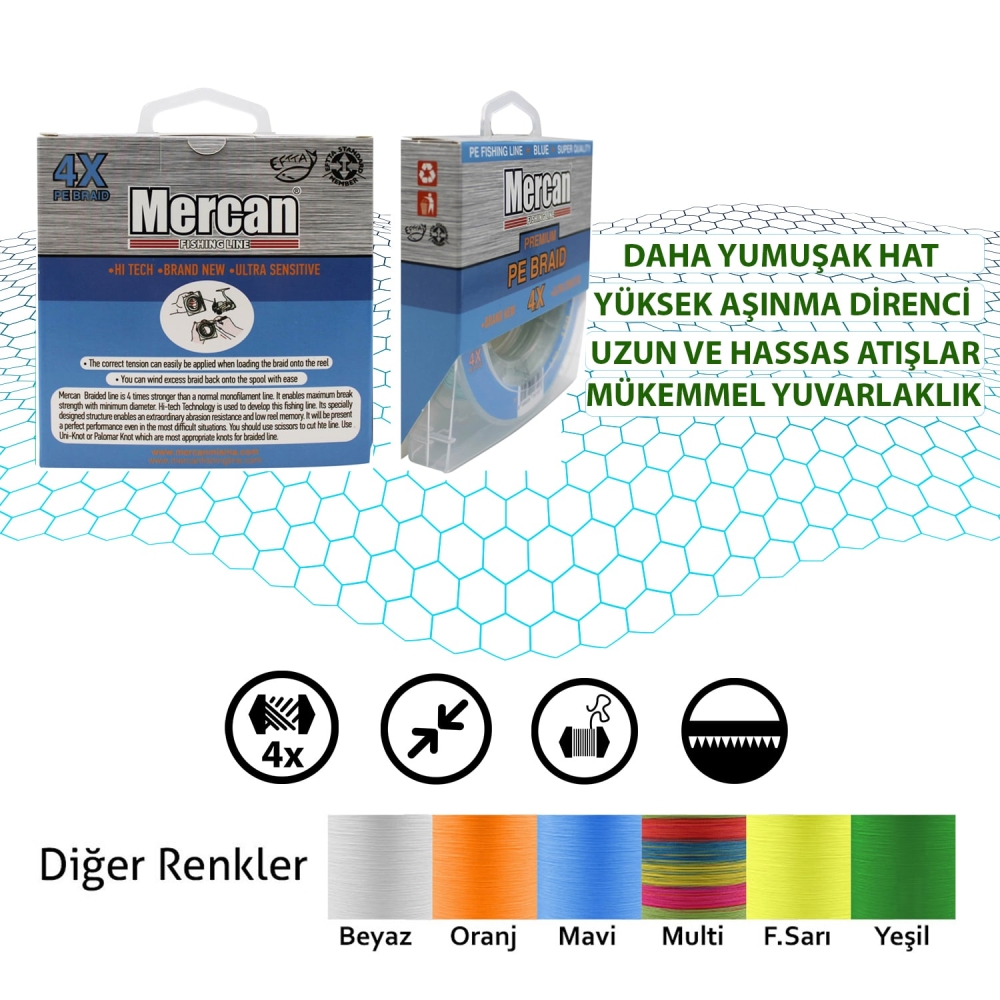 PÜRÜZSÜZ ÇAPAKSIZ HAT : Mercan PE örgü misinamız pürüzsüz ince çapa sahiptir,misinalarımız olta kamışının kılavuzlarından zahmetsizce uçmasına yardımcı olur ve misina karışıklığını ortadan kaldırır. Size özel bir balık tutma deneyimi yaşatacak ve daha fazla balık yakalamanıza yardımcı olacaktır.