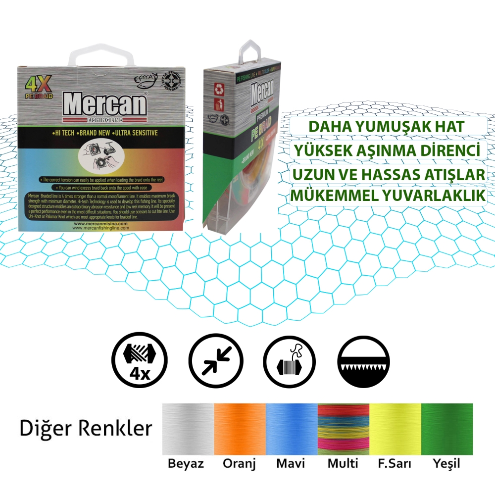 PÜRÜZSÜZ ÇAPAKSIZ HAT : Mercan PE örgü misinamız pürüzsüz ince çapa sahiptir,misinalarımız olta kamışının kılavuzlarından zahmetsizce uçmasına yardımcı olur ve misina karışıklığını ortadan kaldırır. Size özel bir balık tutma deneyimi yaşatacak ve daha fazla balık yakalamanıza yardımcı olacaktır.