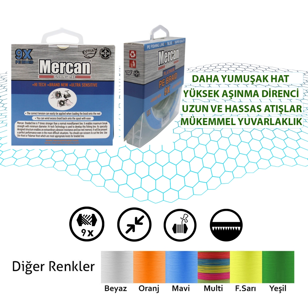 PÜRÜZSÜZ ÇAPAKSIZ HAT : Mercan PE örgü misinamız pürüzsüz ince çapa sahiptir,misinalarımız olta kamışının kılavuzlarından zahmetsizce uçmasına yardımcı olur ve misina karışıklığını ortadan kaldırır. Size özel bir balık tutma deneyimi yaşatacak ve daha fazla balık yakalamanıza yardımcı olacaktır.