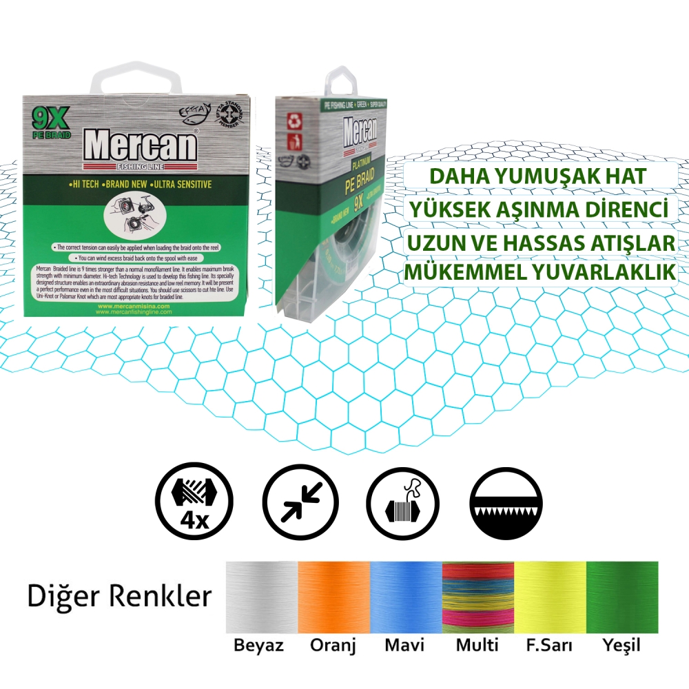 PÜRÜZSÜZ ÇAPAKSIZ HAT : Mercan PE örgü misinamız pürüzsüz ince çapa sahiptir,misinalarımız olta kamışının kılavuzlarından zahmetsizce uçmasına yardımcı olur ve misina karışıklığını ortadan kaldırır. Size özel bir balık tutma deneyimi yaşatacak ve daha fazla balık yakalamanıza yardımcı olacaktır.
